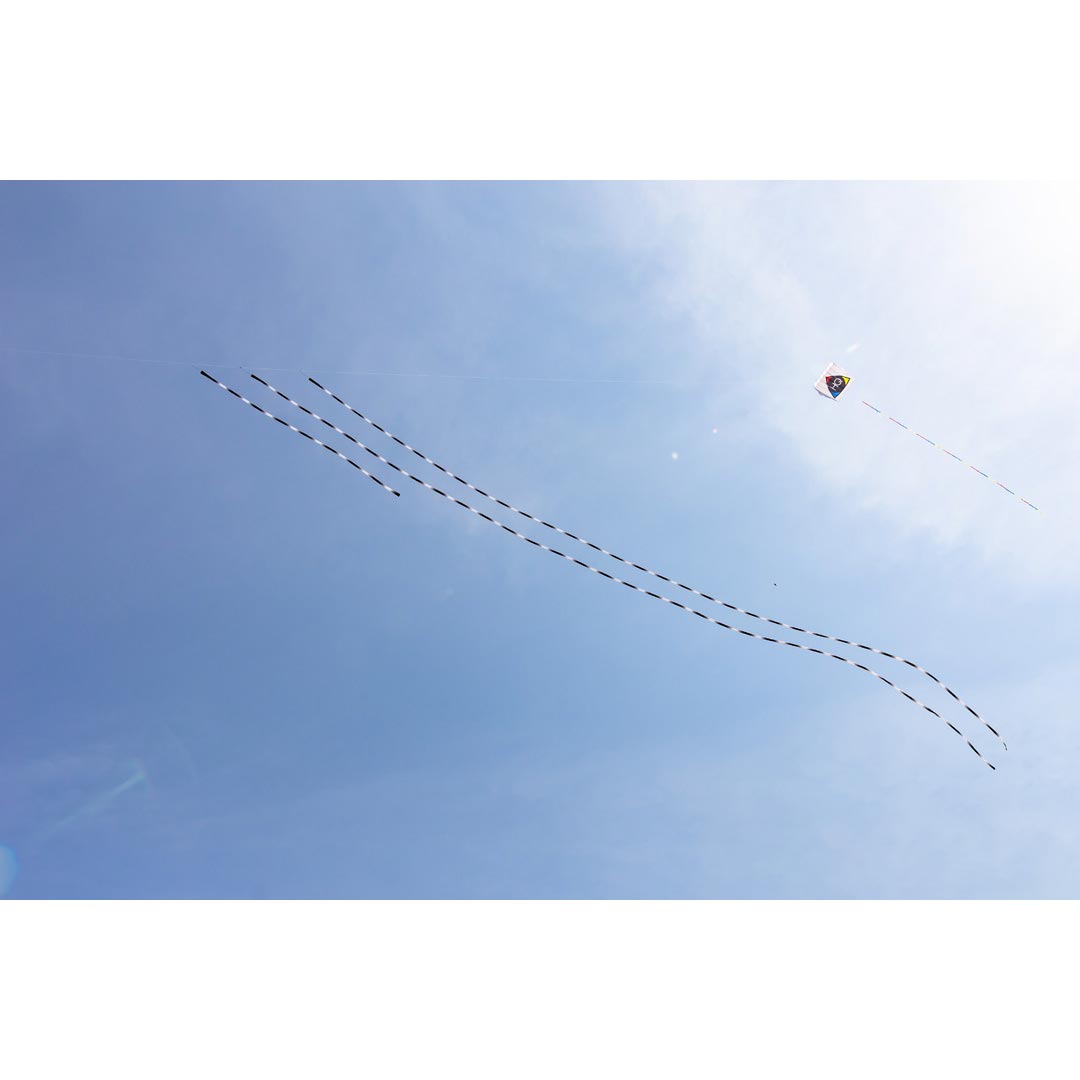 Zum Beispiel befestigt man diesen Drachenschwanz an einen Sportlenkdrachen, werden Wirbel oder Kreise am Himmel zum Hightlight.